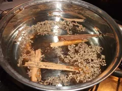 - Cooking Squash and Sweet Potatoes: Fill a large pot with the 750 ml (3 cups) water and add 6 cloves, 2 cinnamon sticks and 2 teaspoons of anise seeds. Bring to a boil and let simmer for about 10 minutes. Strain and reserve (!!!) the water. Place the sweet potatoes in a pot, cover generously with the reserved water and cook over medium heat for 10 minutes; then add the squash and continue to cook until both are very soft. Strain and reserve (!!!) the cooking water! Let the cooking water cool until lukewarm. Mash the sweet potatoes and squash and let cool.
