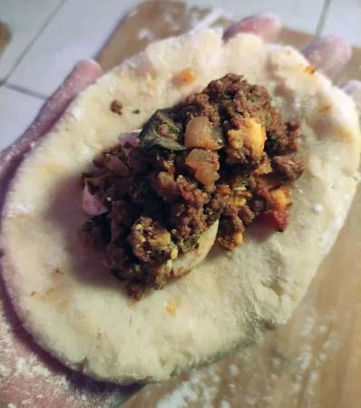 - Then, flour your hands, take a portion of the potato dough, and flatten it in your hand. Place a portion of the meat filling (about a tablespoon or two) in the center of the potato dough and close the edges forming a typical oval shaped Papa rellena. Repeat with the rest of the potato dough and filling. The worst is done.