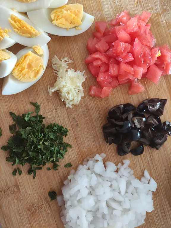 - First prepare all your ingredients: finely chop the onion, mince the garlic, cut the tomato in quarters, remove the seeds and then cut them into small cubes, boil the eggs, peel them and cut into cubes, soak the raisins in warm water, cut the olives into quarters, and finely chop the parsley.