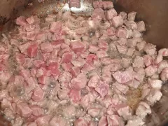 2. Heat a bit of olive oil in a heavy saucepan. Add beef and let brown. Salt and pepper the meat. Then add the aji panca paste or powder, the onion and the garlic. Stir over medium heat for 2 minutes. Add the tomato paste and the oregano and stir for another 2 minutes. Now pour the prepared stock into the saucepan. Then add the potato cubes. Reduce heat, put the lid on, and simmer for 15 minutes.